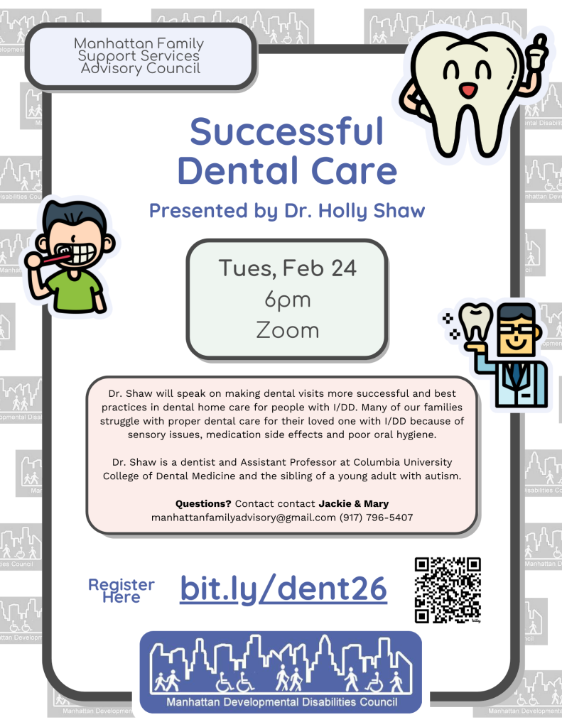 Dr. Shaw will speak on making dental visits more successful and best practices in dental home care for people with I/DD. Many of our families struggle with proper dental care for their loved one with I/DD because of sensory issues, medication side effects and poor oral hygiene.